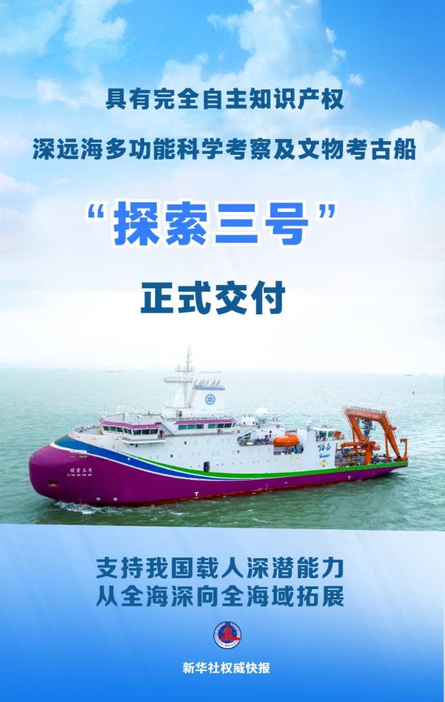 深遠(yuǎn)海多功能科學(xué)考察及文物考古船“探索三號”26日在廣州南沙交付。此船具備完全自主知識產(chǎn)權(quán),是我國首艘具備全球(含極區(qū))深遠(yuǎn)海探測和冰區(qū)載人深潛支持能力的綜合科考船。