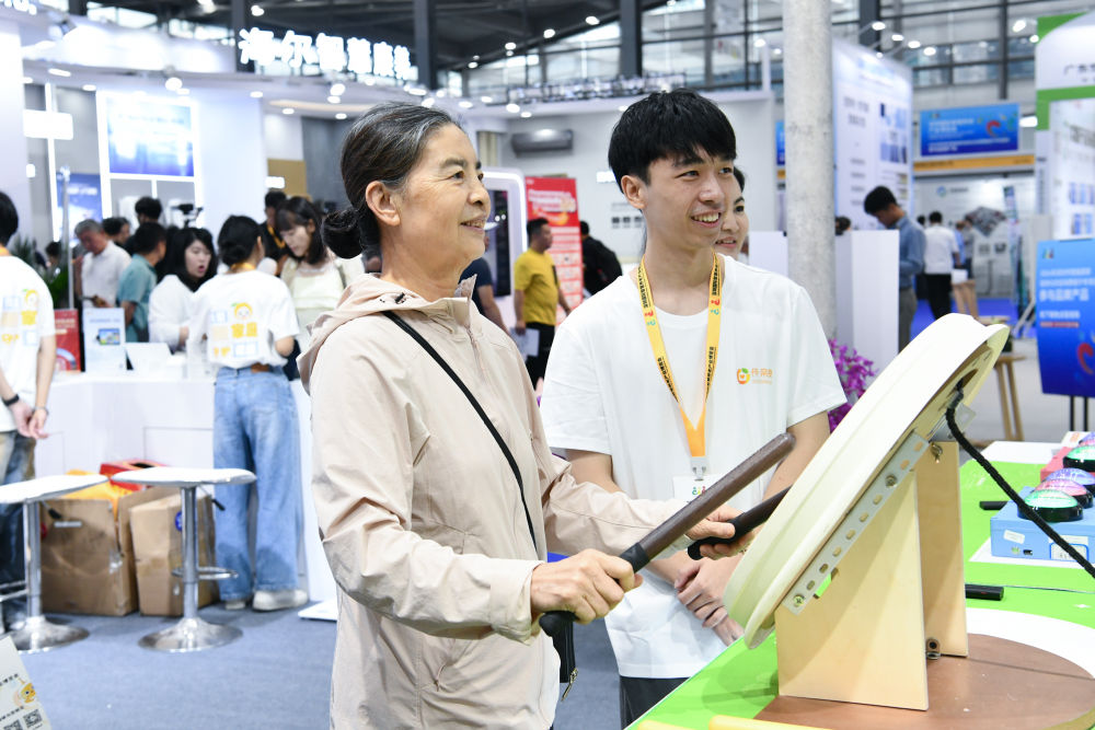 10月27日,老人在2024深圳國際智慧養(yǎng)老產(chǎn)業(yè)博覽會上體驗(yàn)樂齡鼓。(新華社記者 梁旭 攝)