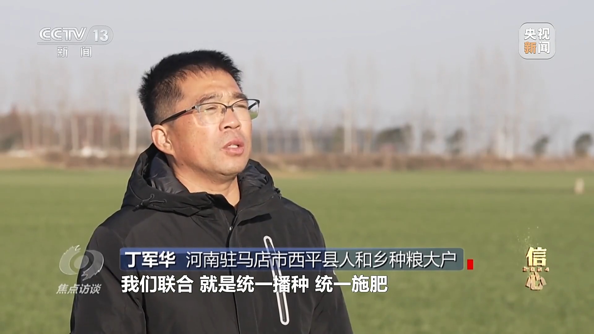 河南駐馬店市西平縣仁和鄉(xiāng)種糧大戶 丁軍華:“我們聯(lián)合就是統(tǒng)一播種、統(tǒng)一施肥、統(tǒng)一管理、統(tǒng)一打藥、統(tǒng)一購銷和統(tǒng)一收割,做到了‘六統(tǒng)一’,共同抱團(tuán)去跟廠家談判、爭取最低的價格。這一次小麥播種,我們從黑龍江引進(jìn)大型氣吸型播種機(jī),地少了它不來,用這種播種機(jī),一畝地比普通播種機(jī)增產(chǎn)15%以上?!?/p>