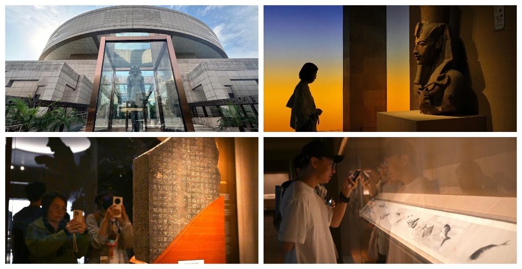 拼圖:(左上、右上)上海博物館人民廣場(chǎng)館的“金字塔之巔:古埃及文明大展”;(左下)上海博物館東館的中國(guó)歷代書(shū)法館(右下)上海博物館東館的中國(guó)歷代繪畫館
