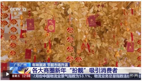 在廣州各大商圈,歡喜過(guò)大年的喜慶裝扮陸續(xù)煥新,有的擺上紅紅火火的“金錢(qián)樹(shù)”,有的在商場(chǎng)內(nèi)設(shè)立各種展覽,增加消費(fèi)者購(gòu)物樂(lè)趣和文化體驗(yàn)?! ?