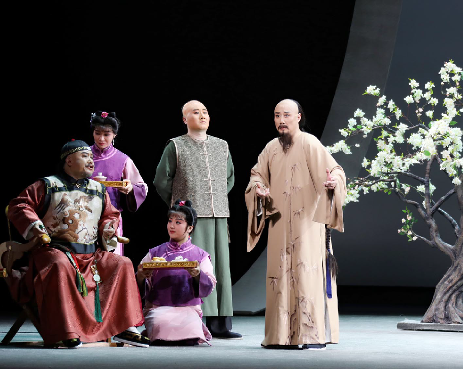 李政成的精湛表演則使創(chuàng)作完美閉環(huán)。在描繪鄭板橋繪畫菊花與蘭花的情景時,他巧妙地采用了文戲武唱的手法,別具匠心地展現(xiàn)了鄭板橋的才華與骨氣。而在劇終部分,長達十多分鐘、包含56個核心唱段的唱腔如波浪般層層推進,將鄭板橋一生的感悟推至觀眾心底。舞臺上的清冷視覺效果與演員熾熱的情感表達形成了鮮明的對比,在戲劇的張力中,一個有溫度、有深度、有情懷的鄭板橋仿佛從歷史中走來,真正“活”了起來。