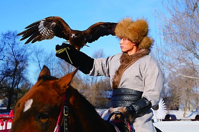 在吉林市霧凇島,“鷹把式”騎馬展示馴鷹技巧。