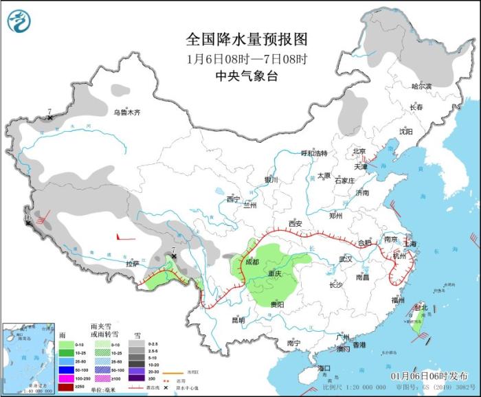 1月6日08時至7日08時,內(nèi)蒙古中東部、黑龍江大部、新疆伊犁河谷和南疆盆地、西藏西部和東部、青海南部、川西高原北部、山東半島北部等地部分地區(qū)有小到中雪或雨夾雪,其中,新疆南疆西部山區(qū)、西藏西部等地部分地區(qū)有大雪,局地暴雪(10~16毫米)。西藏東南部、湖北西南部、重慶大部、貴州西北部、云南東北部、臺灣島東部等地部分地區(qū)有小雨。內(nèi)蒙古中東部、遼東半島、山東半島、浙江北部等地部分地區(qū)有4~6級風(fēng)(見圖1)。