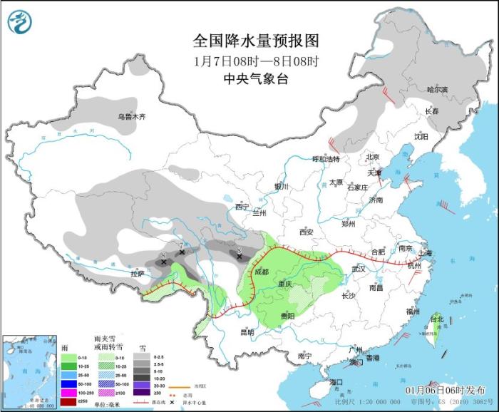 圖1 全國降水量預(yù)報圖(1月6日08時-7日08時)