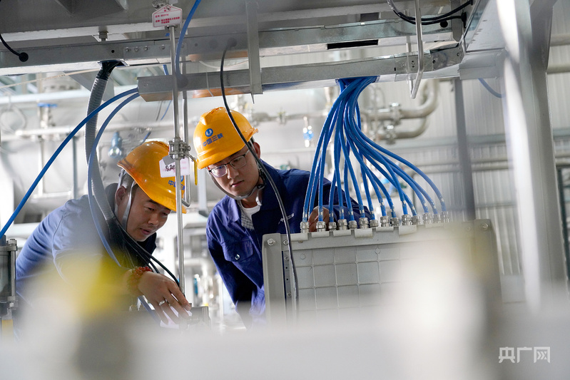 內(nèi)蒙古鄂爾多斯,工人利用光伏發(fā)出的綠電制取綠氫