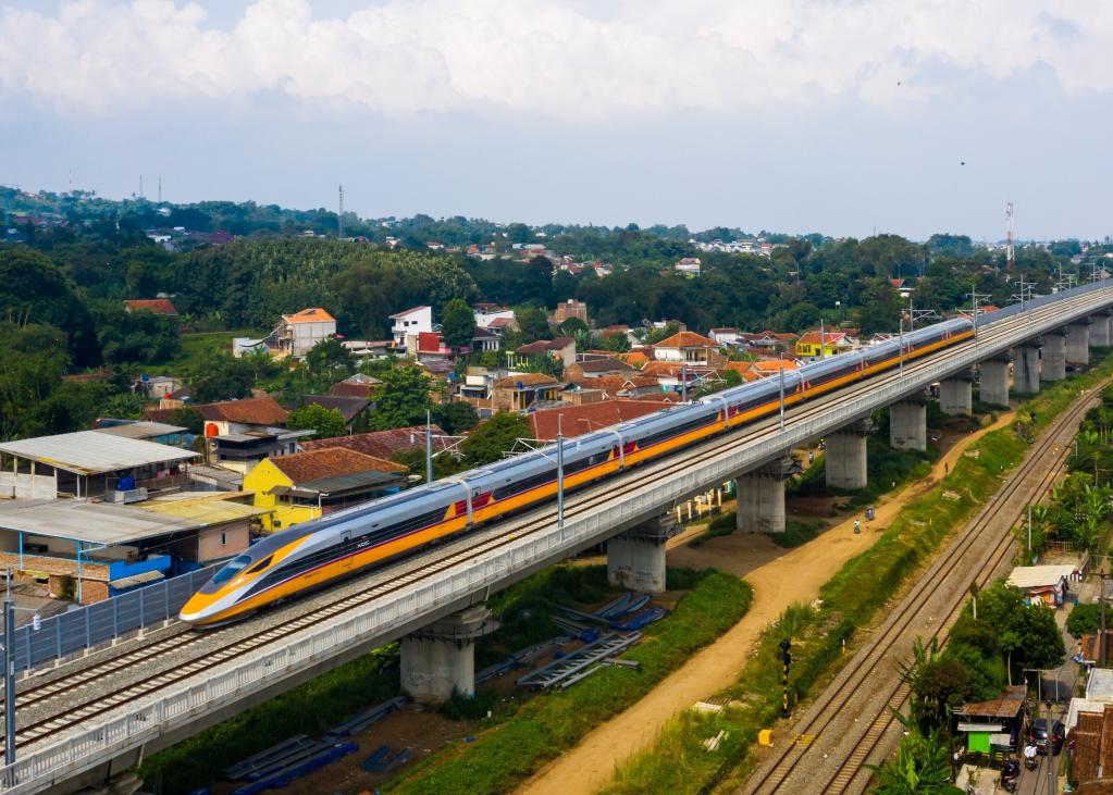 這是2023年5月22日拍攝的行駛在印度尼西亞雅萬高鐵沿線的雅萬高鐵綜合檢測列車(無人機照片)。新華社發(fā)(中國鐵路國際有限公司供圖)