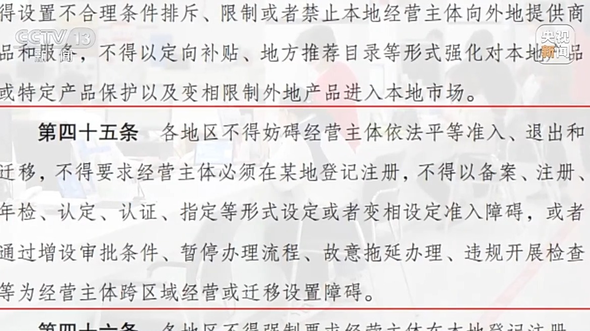 《全國統(tǒng)一大市場建設(shè)指引》強調(diào),不得以通過增設(shè)審批條件、暫停辦理流程、故意拖延辦理、違規(guī)開展檢查等為經(jīng)營主體跨區(qū)域經(jīng)營或遷移設(shè)置障礙,并將其作為加力破除地方保護(hù)和市場分割的重要舉措。