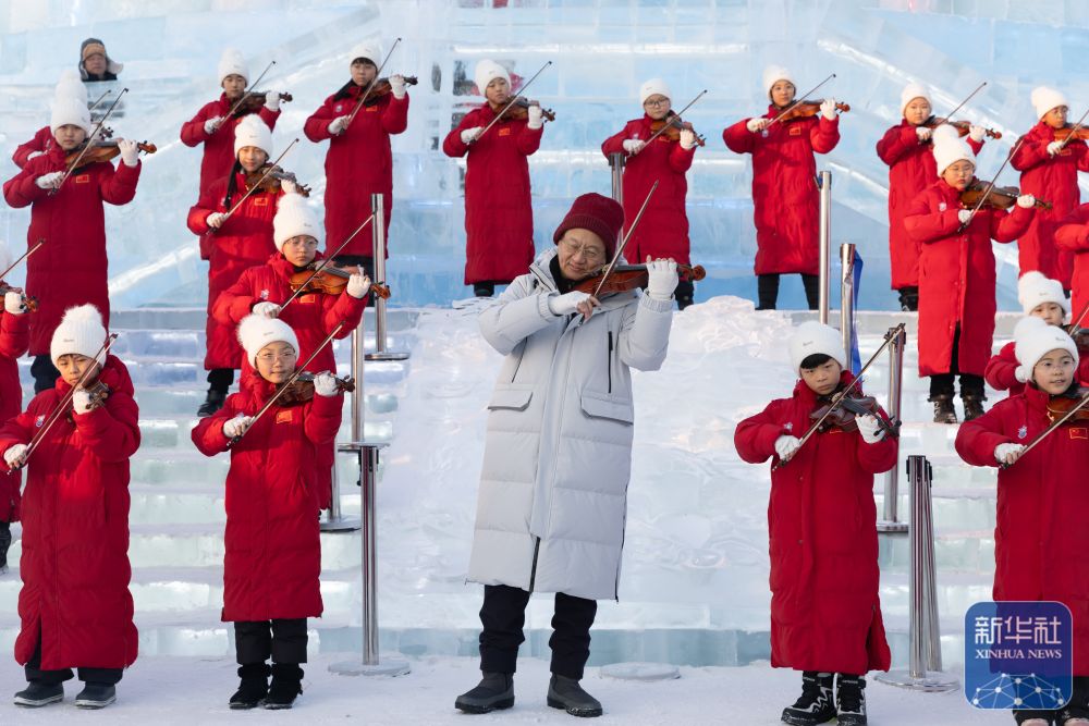 1月12日,小提琴演奏家薛蘇里與哈爾濱勛菲爾德少兒藝術(shù)團(tuán)的小提琴演奏者在音樂“快閃”上演奏。