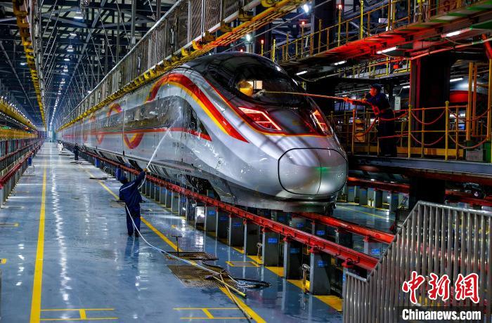 圖為修理庫(kù)中,工作人員清洗動(dòng)車?!垥?攝