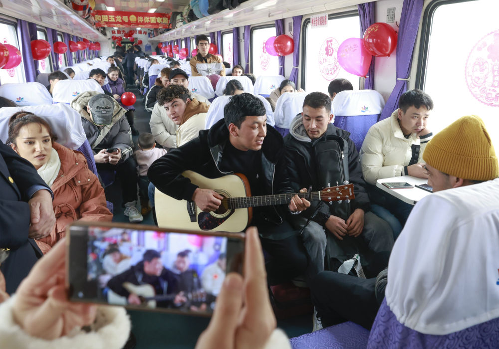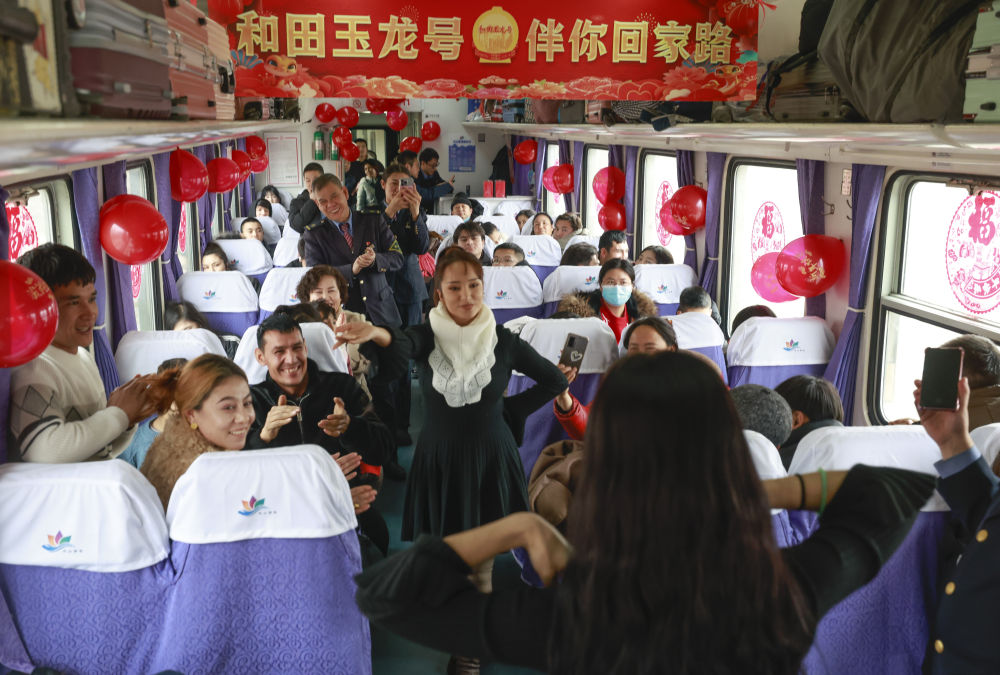 這次坐車,布麥熱姆發(fā)現(xiàn)了新變化:車廂的連接處貼上了對聯(lián),車窗上多了喜慶的窗花。“回家后幫我媽打掃衛(wèi)生,再給她包個紅包。”布麥熱姆說,年味十足的車廂倒是提醒他,回家要抓緊備年貨了。