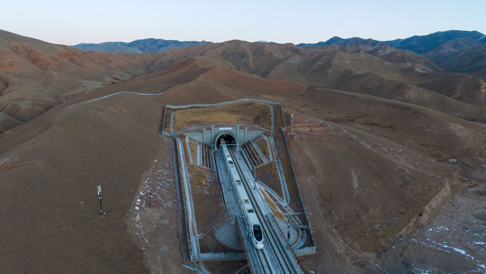 1月14日8時20分許,蘭州西發(fā)往武威東的D8885次動車組列車穿過新烏鞘嶺隧道。這是新烏鞘嶺隧道通車后迎來的首列春運(yùn)列車(無人機(jī)照片)。新華社記者 郎兵兵 攝