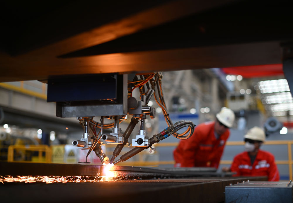 工作人員在海油工程天津智能制造基地制管作業(yè)車間調(diào)試數(shù)控切板機(jī)(2024年10月30日攝)。 新華社記者 趙子碩 攝