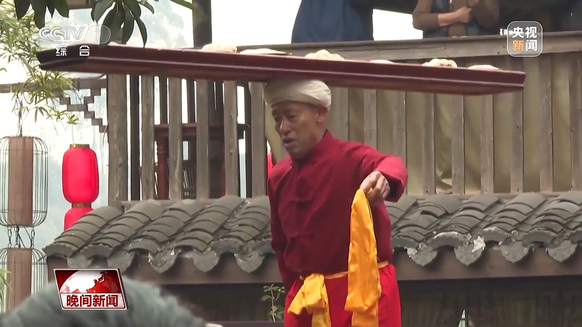 古鎮(zhèn)街道狹長,辦宴席時需要快速傳菜,于是便有了“打盆”這種獨特的上菜方式。在我們的左手邊,就有一位當(dāng)?shù)乩先苏诒硌荽蚺杞^技。