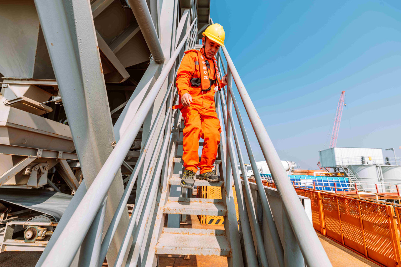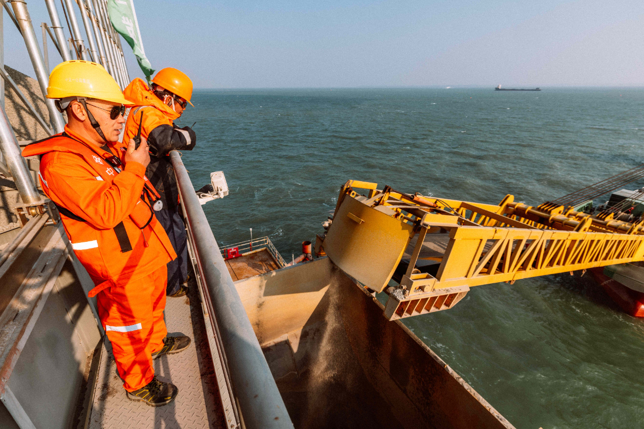 1月17日,夕陽下的廈門劉五店港區(qū),北風(fēng)勁吹。在距離中交一公局集團(tuán)廈金大橋(廈門段)項(xiàng)目海上平臺(tái)混凝土操作員梁芝敬站立位置不到30米的洋面上,一艘船身印有“帆順168”字樣的補(bǔ)料船,裝載著4000多噸砂石緩緩抵近。船頭前方延伸出一條25米長的傳送皮帶,將船上的砂料源源不斷地送抵老梁眼前的鋼制固料斗內(nèi)。當(dāng)天他們要趁著海水退潮帶來的作業(yè)窗口,為站里補(bǔ)上700噸機(jī)制砂和900噸粒徑10到20毫米的小石子,以確?;炷琳旧a(chǎn)不停機(jī)。