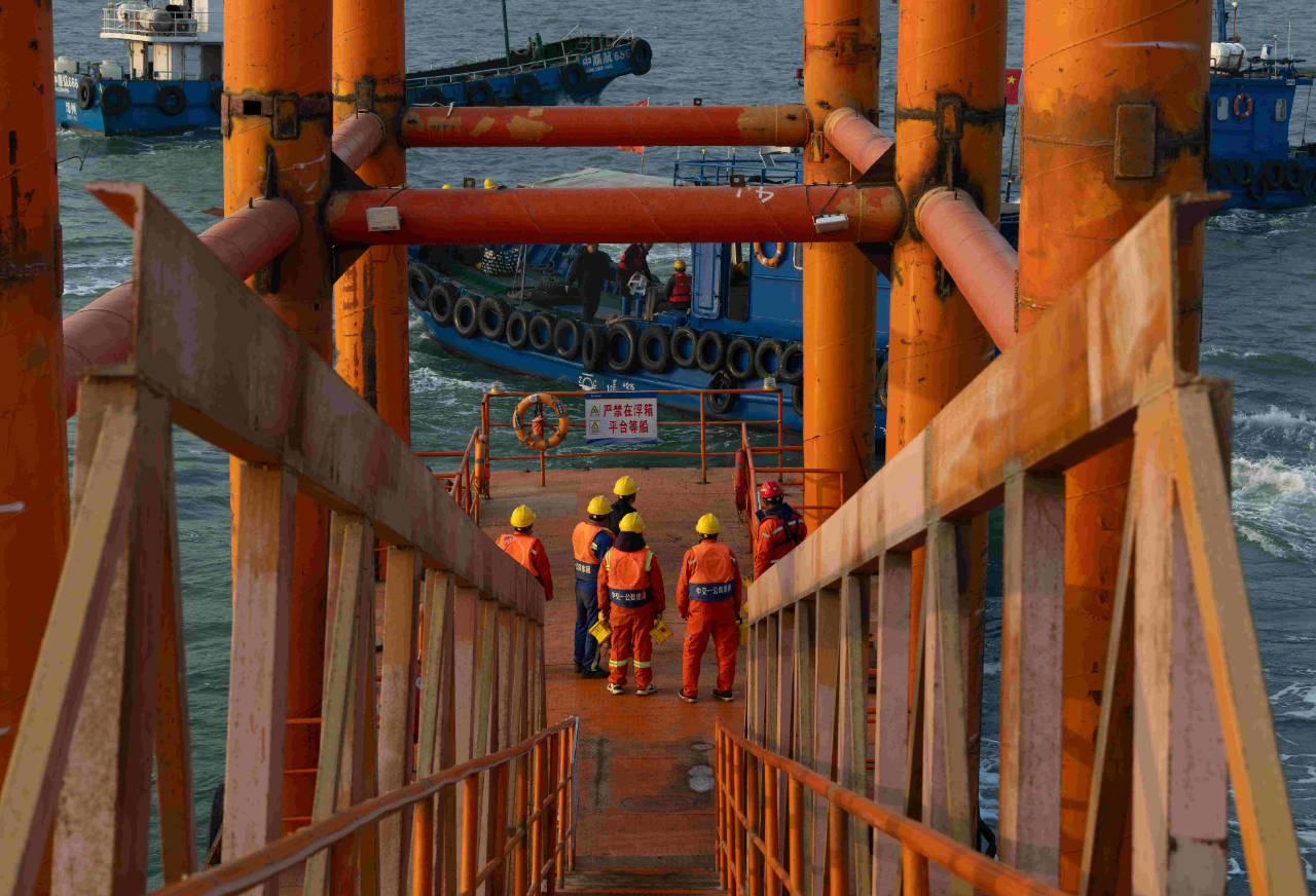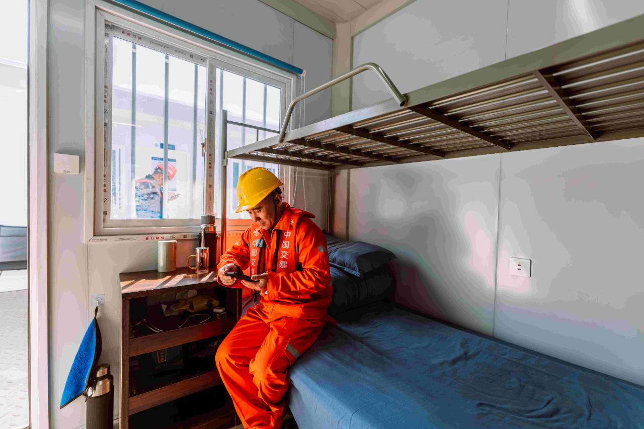 梁芝敬和工友們工作的位置在離岸2海里的海上。一座總面積5萬多平方米的海上平臺(tái),構(gòu)成了建設(shè)者們生活和工作的海上空間。工人們加班建設(shè)的劉五店航道橋,是廈金大橋(廈門段)關(guān)鍵控制性工程,全長1948米,是福建省內(nèi)最大跨徑橋梁,也是福建省首座全離岸式海中懸索橋。春節(jié)前,項(xiàng)目部要完成沉井系梁6000方以及主塔套箱6640方封底混凝土澆筑任務(wù)。為此,梁芝敬和工友們需要不間斷倒班作業(yè),以保障工程任務(wù)能夠如期完成。而記者采訪時(shí),距離梁芝敬上一次離開海上平臺(tái),已經(jīng)過去57天。