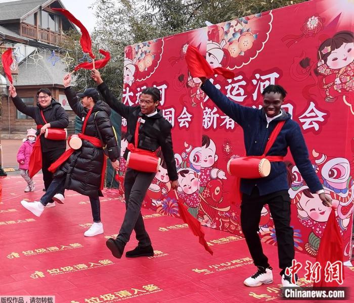 來自北京工業(yè)大學的四位留學生在北京通州大運河新春游園會上體驗打腰鼓。中新網(wǎng) 林勐男 攝