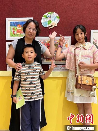 2024年暑期,許志宏一家人前往北京觀展。圖為許志宏的妻子與兒女在畫(huà)作前合影留念。受訪者供圖