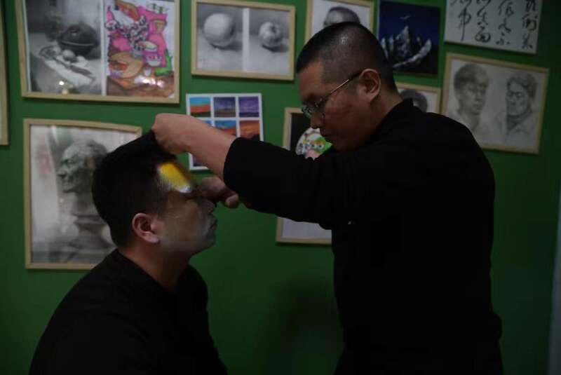 每次演出前,李曉濤要“擇臉”,決定哪張臉化哪個(gè)妝,臉大的演員有優(yōu)勢(shì),承得下更復(fù)雜更多細(xì)節(jié)的妝容;額頭高的人可以畫上半張臉細(xì)節(jié)更多的“三塊瓦”。畫著同一底色的演員表演時(shí)不能站在一起,以免觀眾有重復(fù)的感覺。
