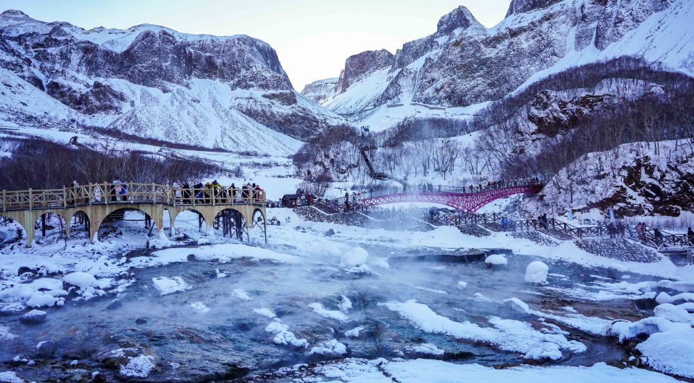 長白山天池以北的延邊州,溫泉室外的樹枝上覆滿積雪,泡池內(nèi)滾燙的地?zé)嵩丛床粩?。伸出腳尖觸水,一股暖意傳遍全身。延邊云集安圖火山泉、龍井氟溫泉、延吉低氘溫泉等多種特色溫泉,吸引海內(nèi)外眾多游客慕名而來。