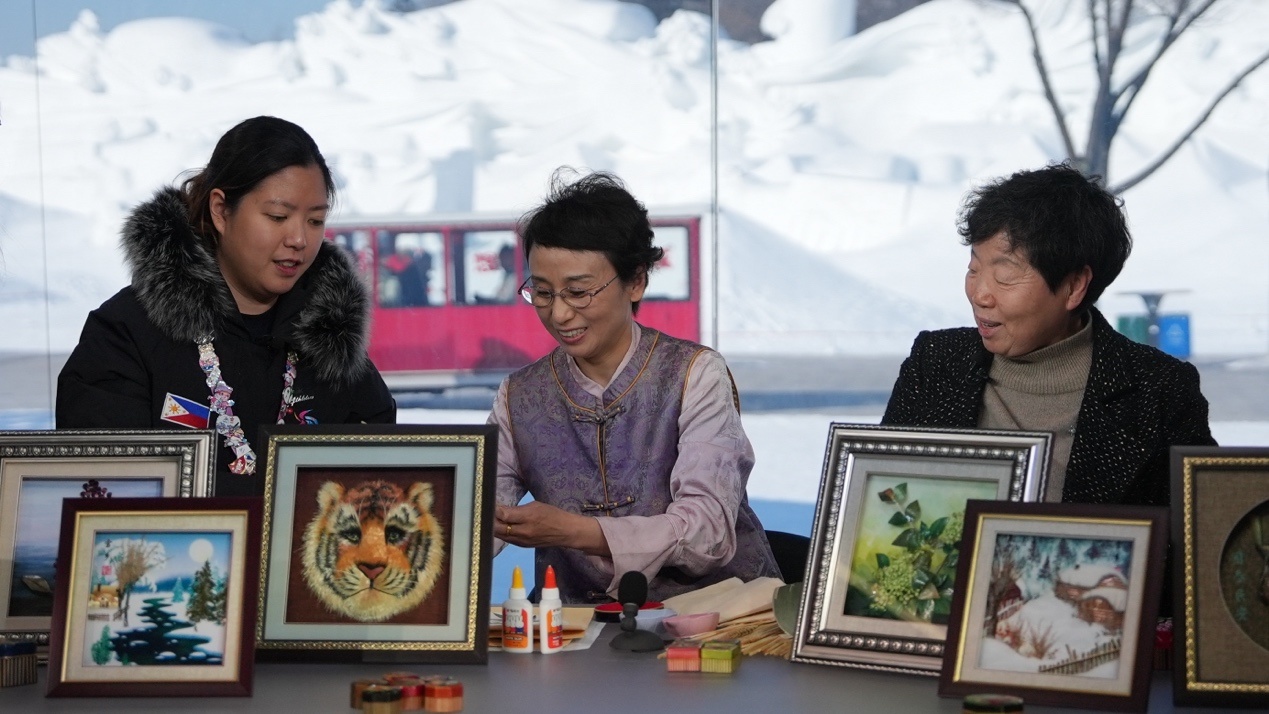 參加“當亞冬會遇上‘非遺年’”人文交流活動的中外嘉賓在哈爾濱太陽島雪博會CMG演播室同慶新春