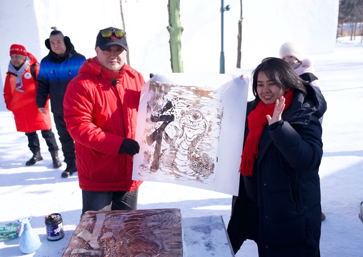 泰國駐華大使館二等秘書王安安在黑龍江省藝術研究院冰版畫研究院副院長盛琰的指導下,制作出冰版畫《畫蛇添福》,用蛇的形狀和漢字的偏旁部首組合雕刻出漢字“?!辈⑼赜〕鰜?,寄托對中國農歷蛇年的祝福。