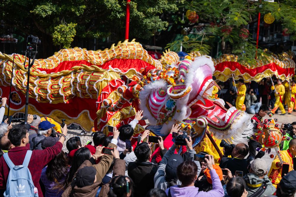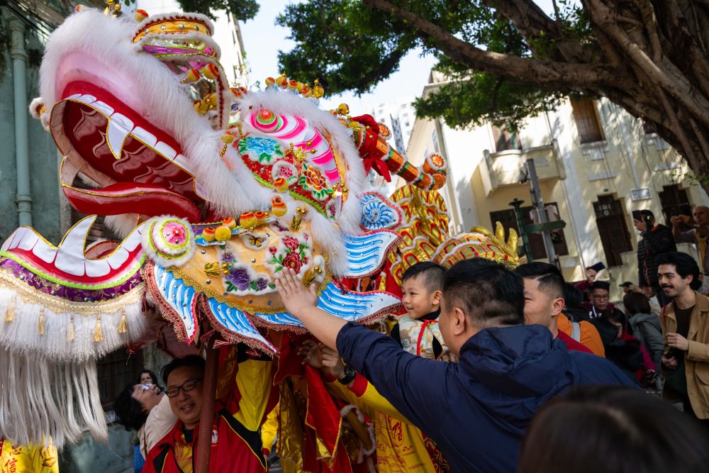 摸摸閃亮的“金龍”鱗片,領(lǐng)上金光燦燦的“元寶”,和財(cái)神爺一起比手勢(shì)自拍……大年初一的上午,澳門(mén)傳統(tǒng)地標(biāo)大三巴再度成為歡樂(lè)的海洋,傳統(tǒng)節(jié)目金龍醒獅雄赳赳巡城,所到之處歡騰一片。