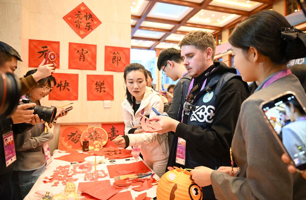 2月12日,一名哈薩克斯坦記者在活動(dòng)現(xiàn)場(chǎng)體驗(yàn)剪紙。當(dāng)日是農(nóng)歷正月十五元宵佳節(jié)。在第九屆亞洲冬季運(yùn)動(dòng)會(huì)亞布力賽區(qū)山地媒體中心,工作人員舉行舞龍舞獅表演、制作花燈、剪紙等互動(dòng)活動(dòng),共度佳節(jié)。新華社記者 胡虎虎 攝