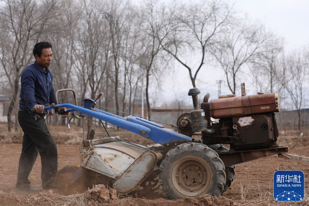 2月19日,在青海省海東市民和回族土族自治縣中川鄉(xiāng)光明村,村民操作農(nóng)機在田間作業(yè)。