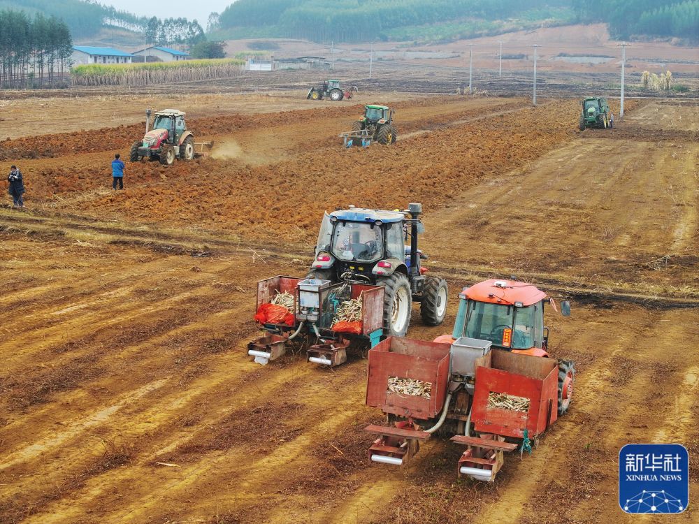 2月19日,在廣西來賓市興賓區(qū)鳳凰鎮(zhèn)國家現(xiàn)代農(nóng)業(yè)產(chǎn)業(yè)園黃安優(yōu)質(zhì)“雙高”糖料蔗基地,農(nóng)民駕駛農(nóng)機在田間作業(yè)(無人機照片)。