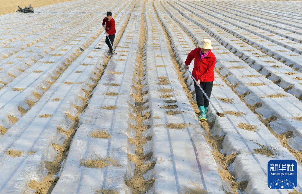2月18日,在河南省商丘市夏邑縣李集鎮(zhèn)李中村紅高粱家庭農(nóng)場,村民為田間鋪設的地膜覆土加固。