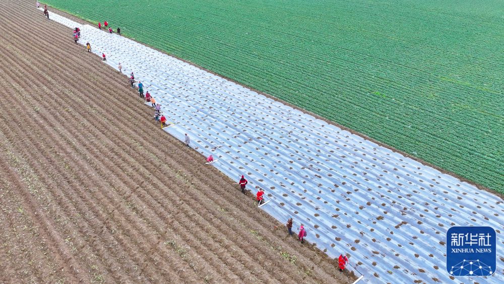 2月18日,在山東省臨沂市郯城縣郯城街道一處蔬菜種植基地,農(nóng)民使用農(nóng)機播種“訂單土豆”(無人機照片)。