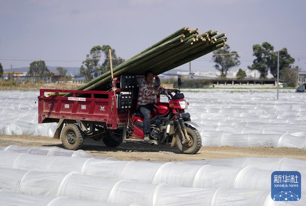 2月19日,在云南省紅河州個舊市大屯街道,農(nóng)戶運送覆膜物資。
