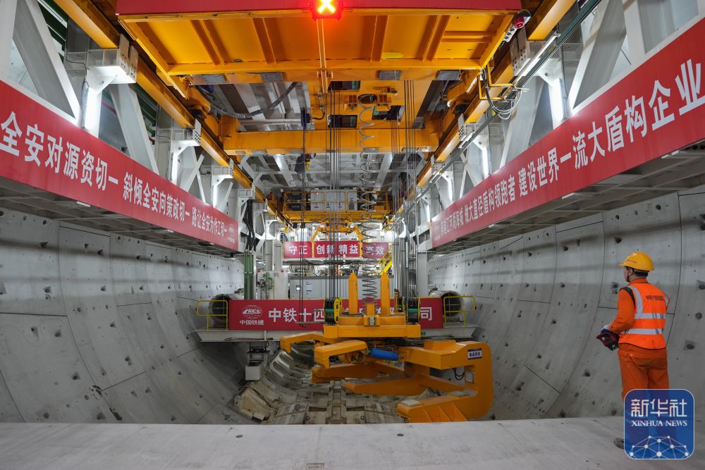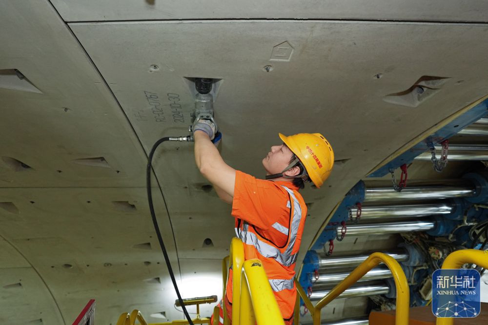 2月25日,中鐵十四局技術(shù)人員在甬舟鐵路金塘海底隧道“甬舟號(hào)”盾構(gòu)機(jī)內(nèi)調(diào)試箱涵吊機(jī)。