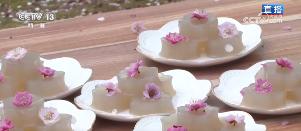 這個(gè)季節(jié)來到芳院村,與賞花踏青最搭配的就是圍爐煮茶了。芳院村的茶也非常特別,叫做“蛋茶”。就把煮開的茶水沖入均勻攪拌的蛋液中,然后再加上冰糖,這就是“蛋茶”。每當(dāng)村里誰家辦大事、干重活的時(shí)候,村民們都會(huì)泡蛋茶來接待,這也是當(dāng)?shù)氐拇褪锥Y。在芳院村,這個(gè)季節(jié)還有一個(gè)春日限定美食,就是梅花糕。它主要的原材料是當(dāng)?shù)氐牡毓戏?,關(guān)鍵在于用了梅花花瓣熬出來的汁。梅花糕不僅形似梅花,而且入口甜糯、味道清雅,這些也是芳院村正在打造的“花樣”經(jīng)濟(jì)。近年來,當(dāng)?shù)卦诒Wo(hù)傳統(tǒng)村落的基礎(chǔ)上,以花為“媒”培育“花樣”經(jīng)濟(jì),吸引游客前來賞花打卡,帶動(dòng)村集體和村民雙增收。