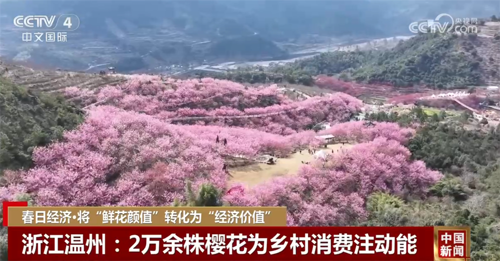 浙江省永嘉縣的溫州櫻花園占地3600畝,已開發(fā)利用1700多畝,種植了2萬余株櫻花,品種涵蓋臺灣牡丹櫻、紅粉佳人櫻等數(shù)十個品種。盛開的櫻花吸引了游客,也帶動了當?shù)夭惋?、住宿、旅游、交通等服?wù)消費快速增長,自2月13日開園以來,櫻花園日均接待游客近3000人次,周末更是突破1萬多人。