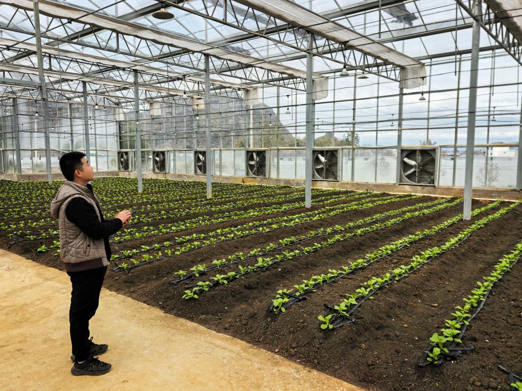 廣西賀州市平桂區(qū)國家現(xiàn)代農(nóng)業(yè)產(chǎn)業(yè)園品種篩選適應(yīng)棚內(nèi),技術(shù)人員陳愈璋利用手機(jī)操控大棚農(nóng)業(yè)設(shè)施。新華社記者王楚然 攝