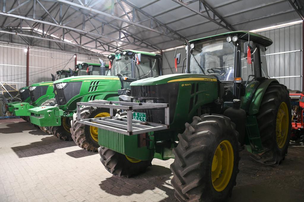 兩臺(tái)嶄新的拖拉機(jī)僅車轱轆就一人多高。陳胡日查說(shuō),這種拖拉機(jī)省油、效率高,一天能種300多畝地。