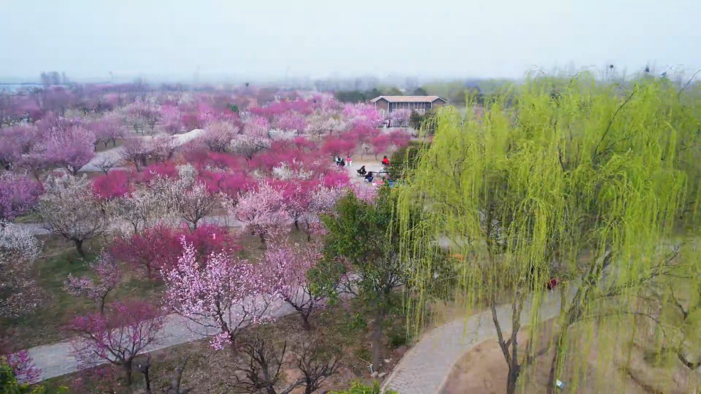 3月15日,游客在江蘇省鹽城市大豐區(qū)梅花灣景區(qū)賞花游玩(無人機照片)。新華社發(fā)(周社根攝)