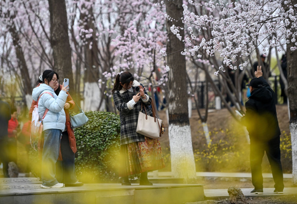 3月15日,游客在天津市紅橋區(qū)北運河畔桃花堤賞花拍照。新華社記者 趙子碩 攝