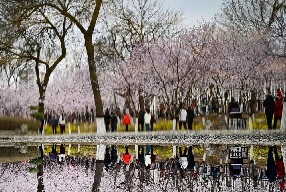 3月15日,游客在天津市紅橋區(qū)北運河畔桃花堤漫步觀賞。新華社記者 趙子碩 攝