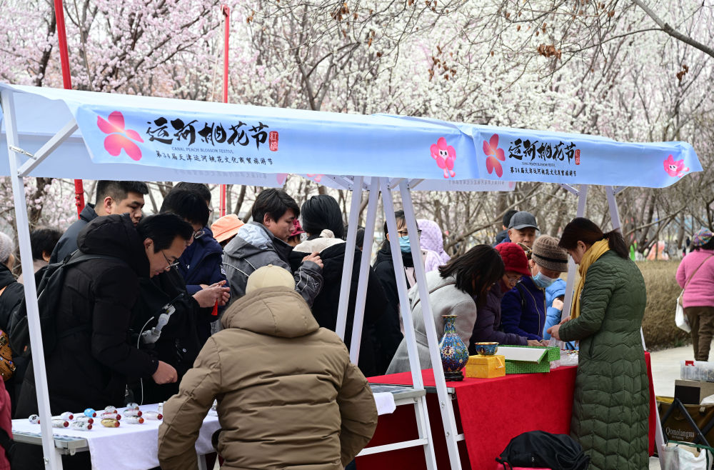 3月15日,游客在天津市紅橋區(qū)北運河畔桃花堤設(shè)置的市集上選購文創(chuàng)產(chǎn)品。新華社記者 趙子碩 攝