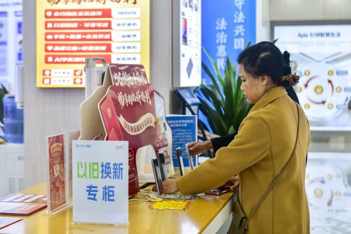 2月21日,在廣西東興市一家手機賣場,消費者在查看手機以舊換新的機型。新華社記者 曹祎銘 攝