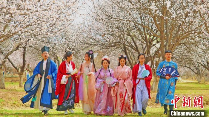 庫(kù)車(chē)杏花綻放,游人身著古裝漫步杏園。(資料圖)庫(kù)車(chē)市融媒體中心供圖