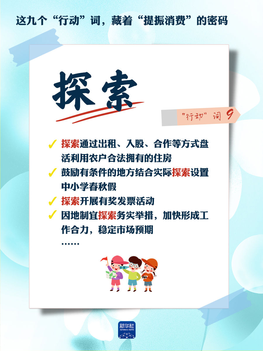 我們梳理出“方案”中使用頻率較高的九個(gè)“行動(dòng)”詞,從這些不同維度的“行動(dòng)”詞中,解讀“專(zhuān)項(xiàng)行動(dòng)”的豐富內(nèi)涵和政策“含金量”,看看哪些是立竿見(jiàn)影、吹糠見(jiàn)米的惠民行動(dòng)?哪些是需要加力擴(kuò)圍、加快補(bǔ)齊的消費(fèi)短板?還有哪些是需要有序推進(jìn)、以點(diǎn)帶面的消費(fèi)“新”點(diǎn)?