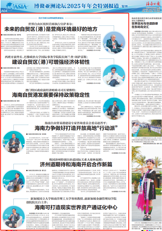 2025年是海南自貿(mào)港封關(guān)運(yùn)作、擴(kuò)大開放之年。當(dāng)天,與會嘉賓圍繞“自由貿(mào)易港賦能全球經(jīng)貿(mào)合作”“自由貿(mào)易港引領(lǐng)全球自由貿(mào)易進(jìn)程”“自由貿(mào)易港開放門戶與互聯(lián)互通”等議題進(jìn)行深入交流探討,共同描繪自貿(mào)港發(fā)展新藍(lán)圖,為海南自貿(mào)港建設(shè)貢獻(xiàn)“博鰲智慧”。