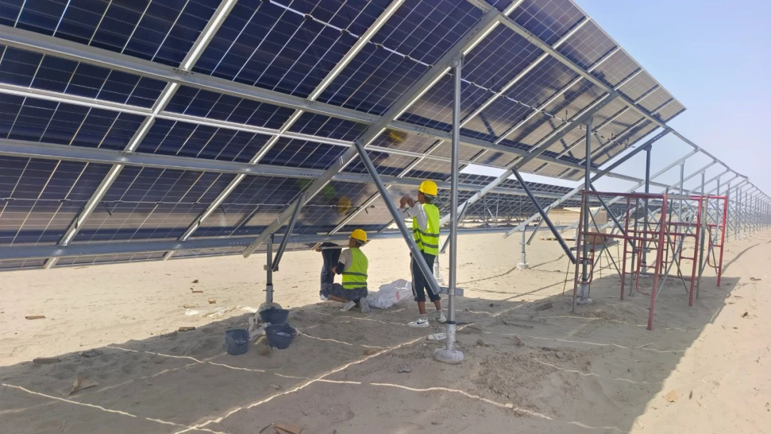 3月28日,在中國電建集團(tuán)新疆分公司新能源公司沙雅縣25萬千瓦光伏項目施工現(xiàn)場,工人們正緊張地安裝光伏板,周圍草方格的鋪設(shè)及梭梭的栽種也在同步開展當(dāng)中。該項目施工負(fù)責(zé)人郝澤權(quán)說,光伏發(fā)電助力機(jī)電井抽取沙漠地表百米以下的微咸水灌溉梭梭林,解決了長期以來沙漠植綠缺水難題,實現(xiàn)生態(tài)與經(jīng)濟(jì)的雙重收益。