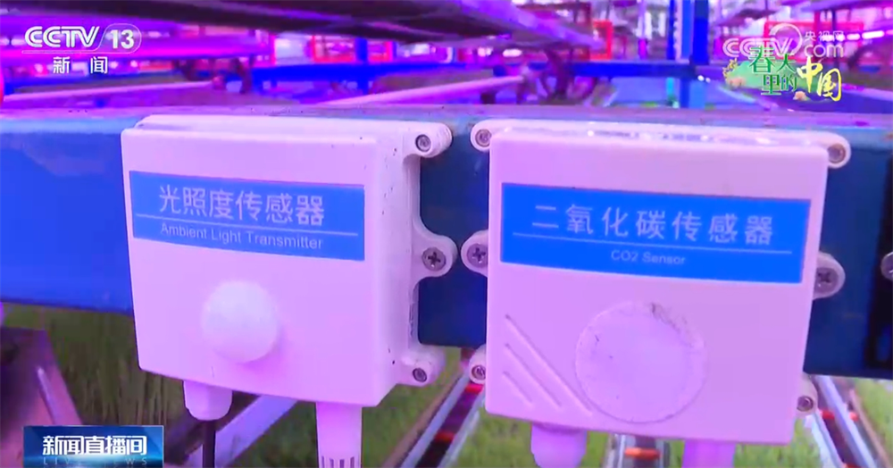 來到這個(gè)育秧車間,我們可以看到現(xiàn)在的秧苗都已經(jīng)坐上電梯了。在立體循環(huán)育秧架上,一盤盤綠油油的秧苗坐著升降梯輪流接受光照。架子上還裝有智能傳感器,把溫度、濕度等信息實(shí)時(shí)顯示在大屏上。同時(shí),還可以用手機(jī)進(jìn)行遠(yuǎn)程操控,根據(jù)秧苗長勢自動(dòng)進(jìn)行補(bǔ)光、噴淋。