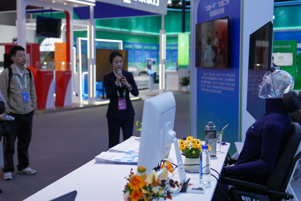 在中關(guān)村展示中心常設(shè)展內(nèi),參觀者在聽取“北腦一號”“北腦二號”智能腦機系統(tǒng)介紹。新華社記者 鞠煥宗 攝