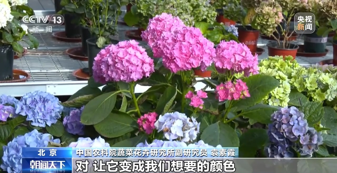 繡球被稱為植物中的變色龍,在中國(guó)農(nóng)科院的實(shí)驗(yàn)大棚里,粉色的花朵經(jīng)過(guò)科研人員的調(diào)控后,就會(huì)變成藍(lán)色稀有色,深受消費(fèi)者的喜愛(ài)。